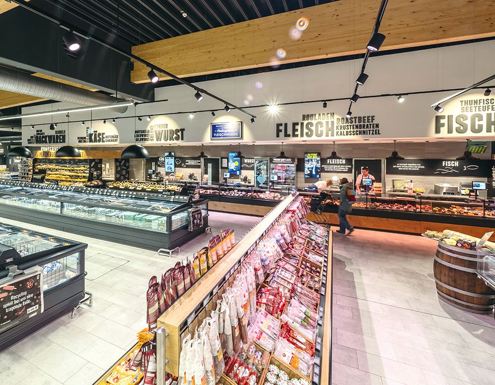 Den Edeka in Penzberg gab es fast 50 Jahre, bis der Standort im Jahr 2023 verlagert wurde. Herausgekommen ist ein Markt, der Innovation und Emotion gekonnt vereint. Die große Glasfront schafft eine offene, freundliche Atmosphäre. Die Kunden können wie gewohnt Kiosk und Getränkemarkt gesondert ansteuern oder zwischen dem Hauptmarkt und den nun teilintegrierten Bereichen wechseln. Breite Gänge, eine klare Kennzeichnung der Warengruppen sowie Bodenaufkleber sorgen dafür, dass sich Kunden mühelos orientieren können.